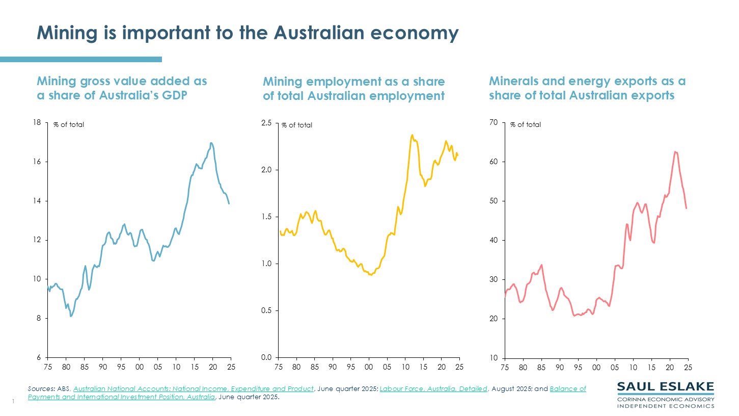 Saul Eslake’s presentation to the 2025 Annual Congress of the Australian Institute of Mining and Metallurgy, in Brisbane on 17th October. It looks at the contribution of the resources sector to Australia’s economy and government revenues, the impact of the on-going slowdown in the Chinese economy on its demands for Australian minerals and energy exports, the prospects for other economy to ‘make up’ for slowing Chinese demand, and the prospects for Australia to capitalize on the growing demand for ‘critical minerals’ flowing from heightened geo-political uncertainty, the energy transition and the ‘AI revolution’.